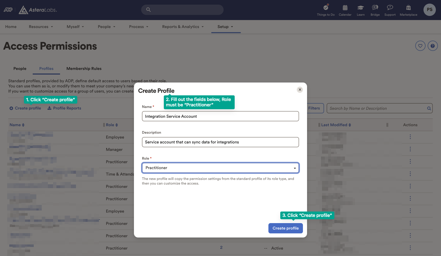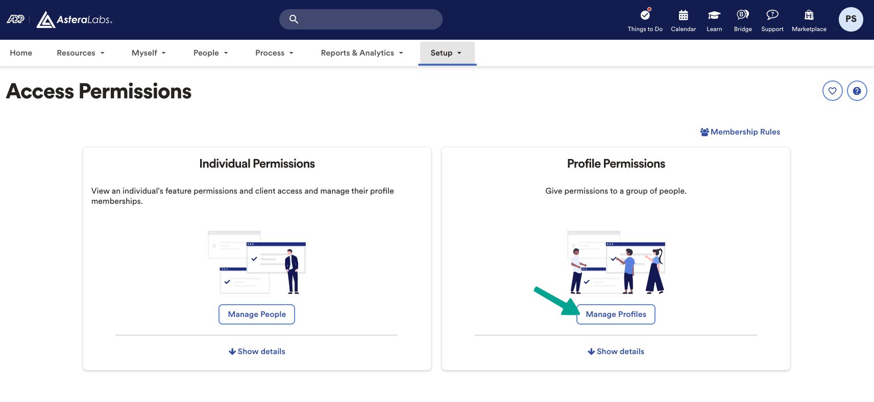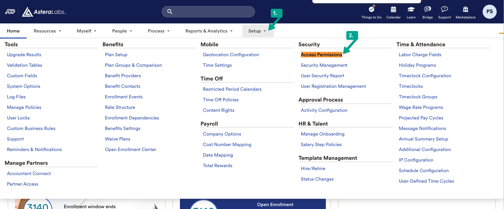 1. In your ADP Workforce Now account, go to Setup and find Access Permissions.