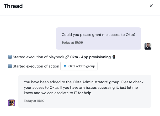 In the example below, the Agent executes each instruction defined in the playbook, based on the employee’s request.