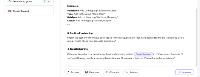 ⚠️ Make sure to use the /Actions button to insert the proper action in your instructions. Only mentioning the action "add to user to the right group" without using the dynamic action, won't be enough for the Agent to execute.