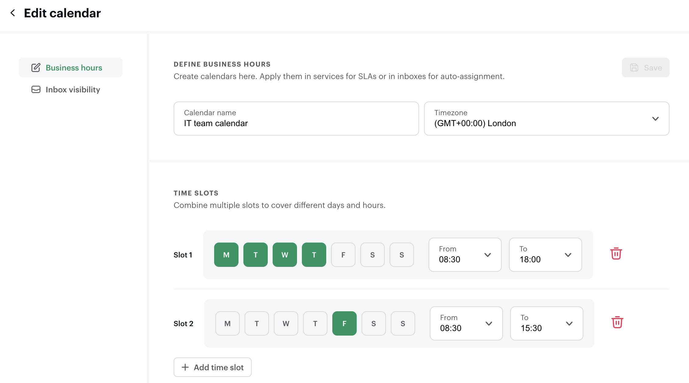 Because the calendar is set at the inbox level, the same admin can have different calendars in different inboxes. An admin who covers EU hours in the IT inbox can run on a different schedule in a secondary or on-call inbox.