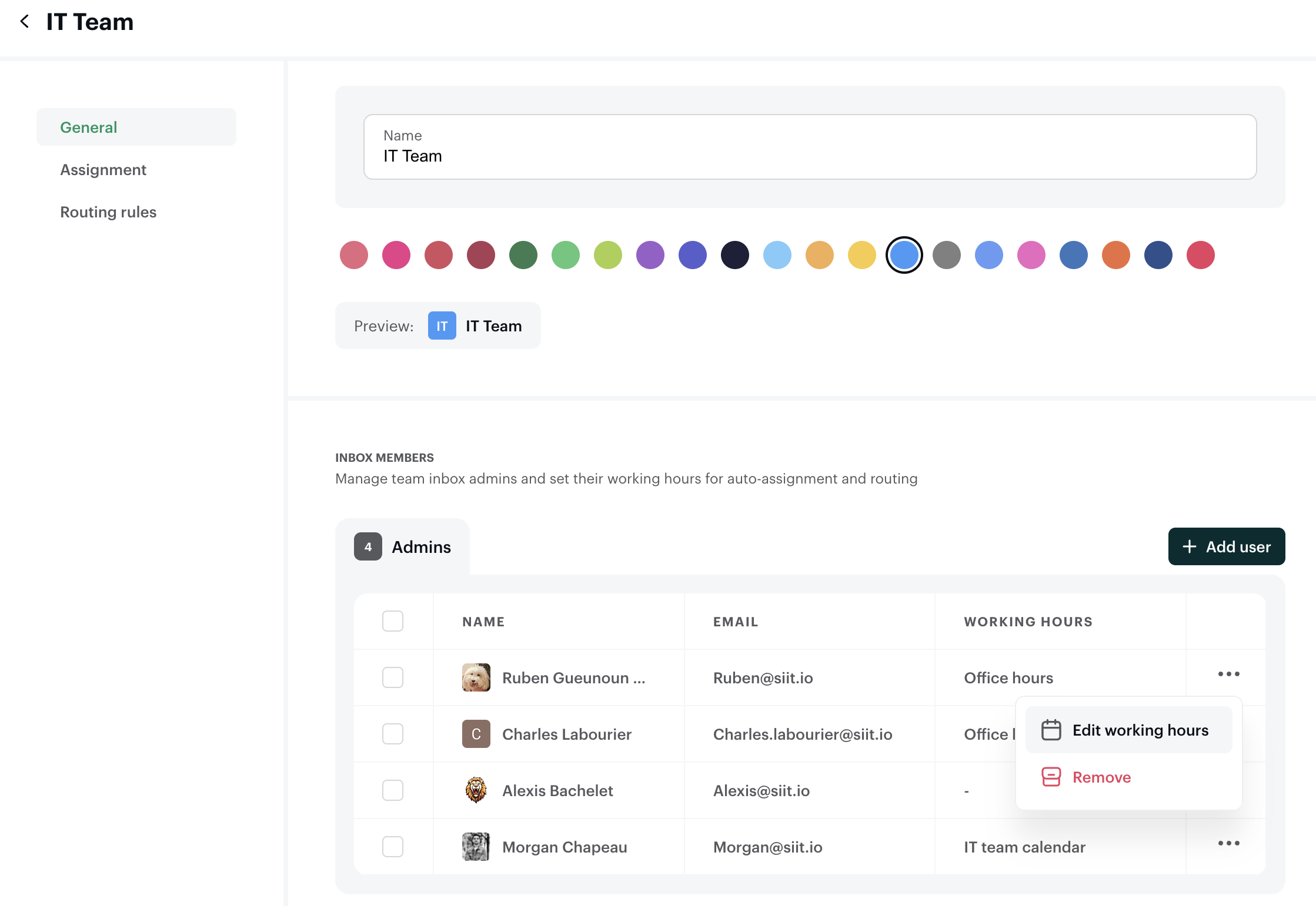 In each inbox's settings, assign a Business Calendar to each admin member. Siit uses this to determine their availability when routing requests automatically within that inbox.