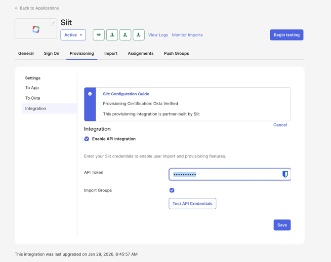 - Use the token found there to fill the API key in the provisioning tab in Okta